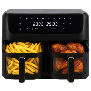 - Zdrowie bez kompromisów: Przygotowuj ulubione dania, takie jak frytki, skrzydełka, warzywa czy nawet ciasta, używając do 80% mniej tłuszczu niż w tradycyjnym smażeniu. Technologia gorącego powietrza zapewnia idealną teksturę bez konieczności zanurzania potraw w oleju.