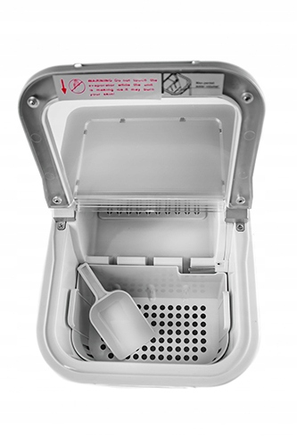 Kostkarka wyposażona jest w przeźroczystą pokrywę, która umożliwia łatwe sprawdzenie ilości wytworzonego lodu. Dzięki diodom LED zawsze będziesz informowany o stanie pracy urządzenia, konieczności dolania wody lub zapełnieniu pojemnika na lód. Urządzenie jest energooszczędne – automatycznie wyłącza się po zakończeniu pracy, co przekłada się na niższe rachunki za prąd.