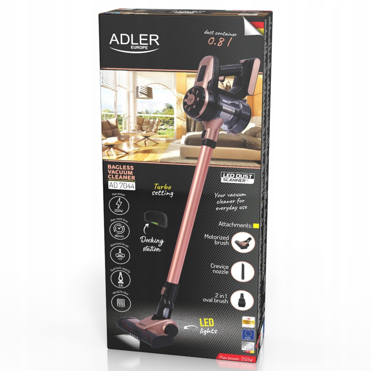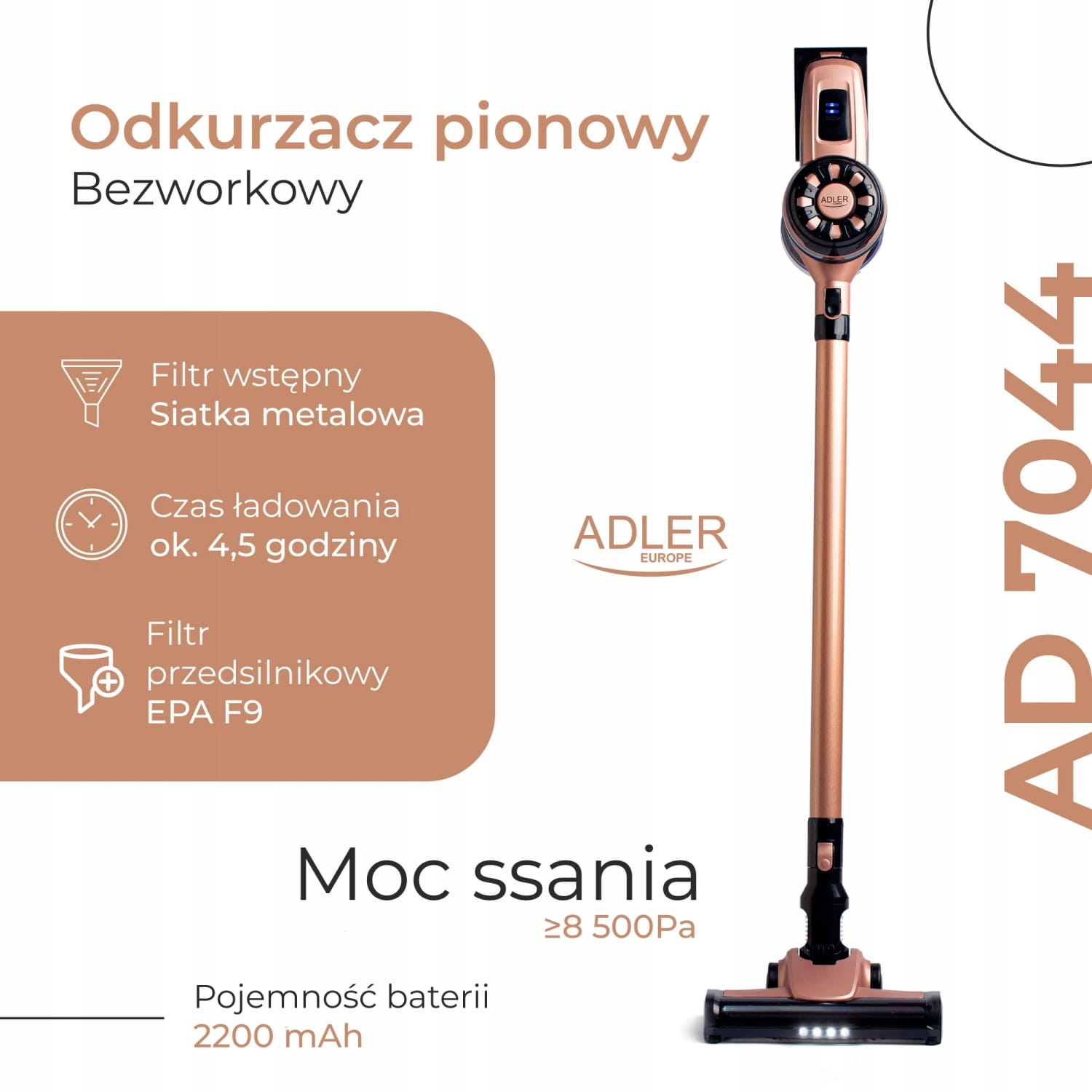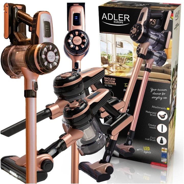 Adler AD 7044 – Odkurzaj bez ograniczeń, ciesz się czystością!Adler AD 7044 to wysokowydajny, bezprzewodowy odkurzacz pionowy, który zapewnia niespotykaną wygodę sprzątania w każdym zakątku domu, biura, a nawet w samochodzie. Dzięki mocy ssania do 12 000 Pa i funkcji TURBO bez problemu usuniesz uporczywe zanieczyszczenia z dywanów i tapicerki. Wbudowane światło LED w szczotce pomaga dostrzec najmniejsze okruchy, a do 40 minut pracy na jednym ładowaniu wystarczy, by posprzątać całe mieszkanie! Lekka i bezprzewodowa konstrukcja oraz uchwyt ścienny z poziomnicą gwarantują łatwe przechowywanie i maksymalną wygodę użytkowania. Zestaw zawiera: