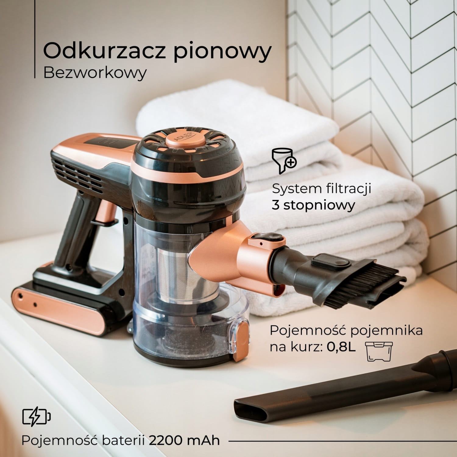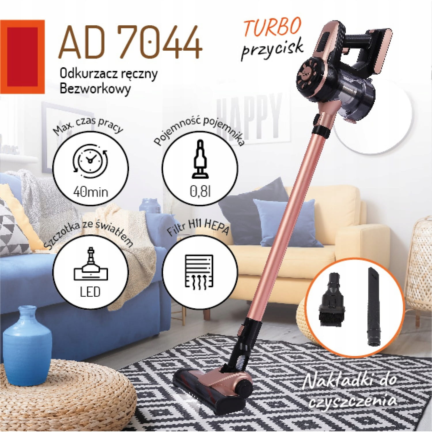 Bezprzewodowy odkurzacz pionowy bezworkowy z turbo i światłem LED AD 7044