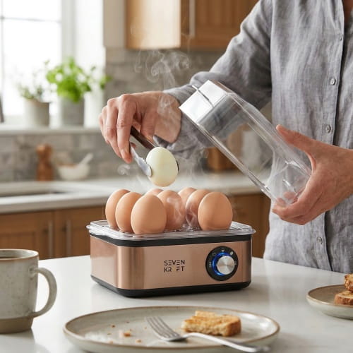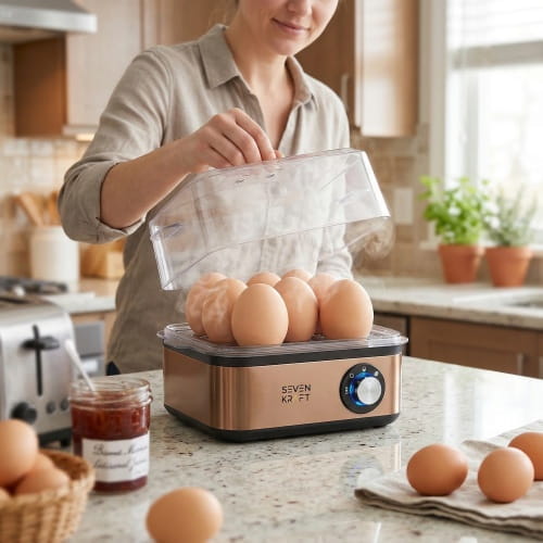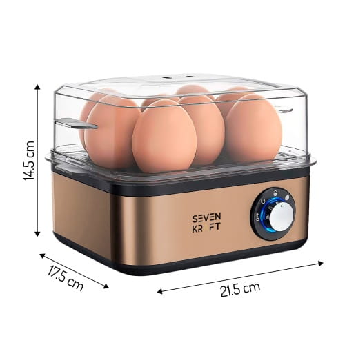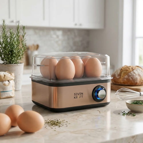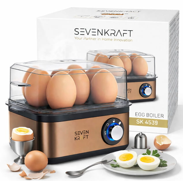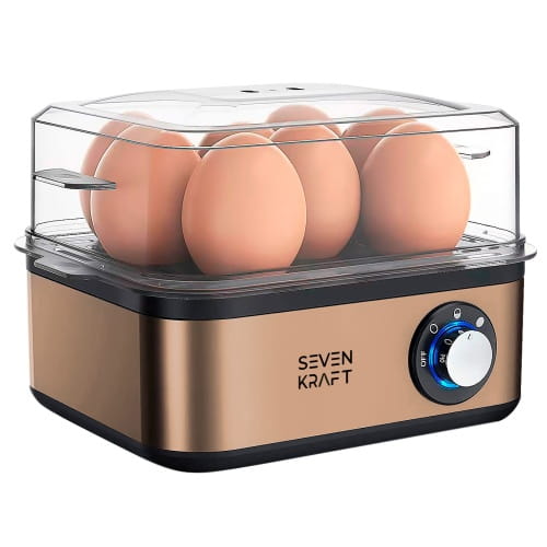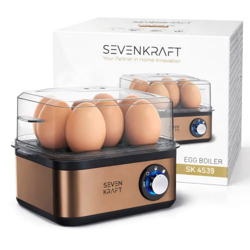 Jajowar na 8 Jaj SK 4539 - idealne jajka na miękko, średnio lub twardoJajowar Sevenkraft SK 4539C o mocy 500W (maks. 800W) pozwala na przygotowanie od 1 do 8 jaj jednocześnie, bez pilnowania garnka. Dzięki automatycznemu wyłączaniu i sygnałowi dźwiękowemu, zapewnia wygodę i powtarzalne rezultaty każdego ranka. Zestaw zawiera: