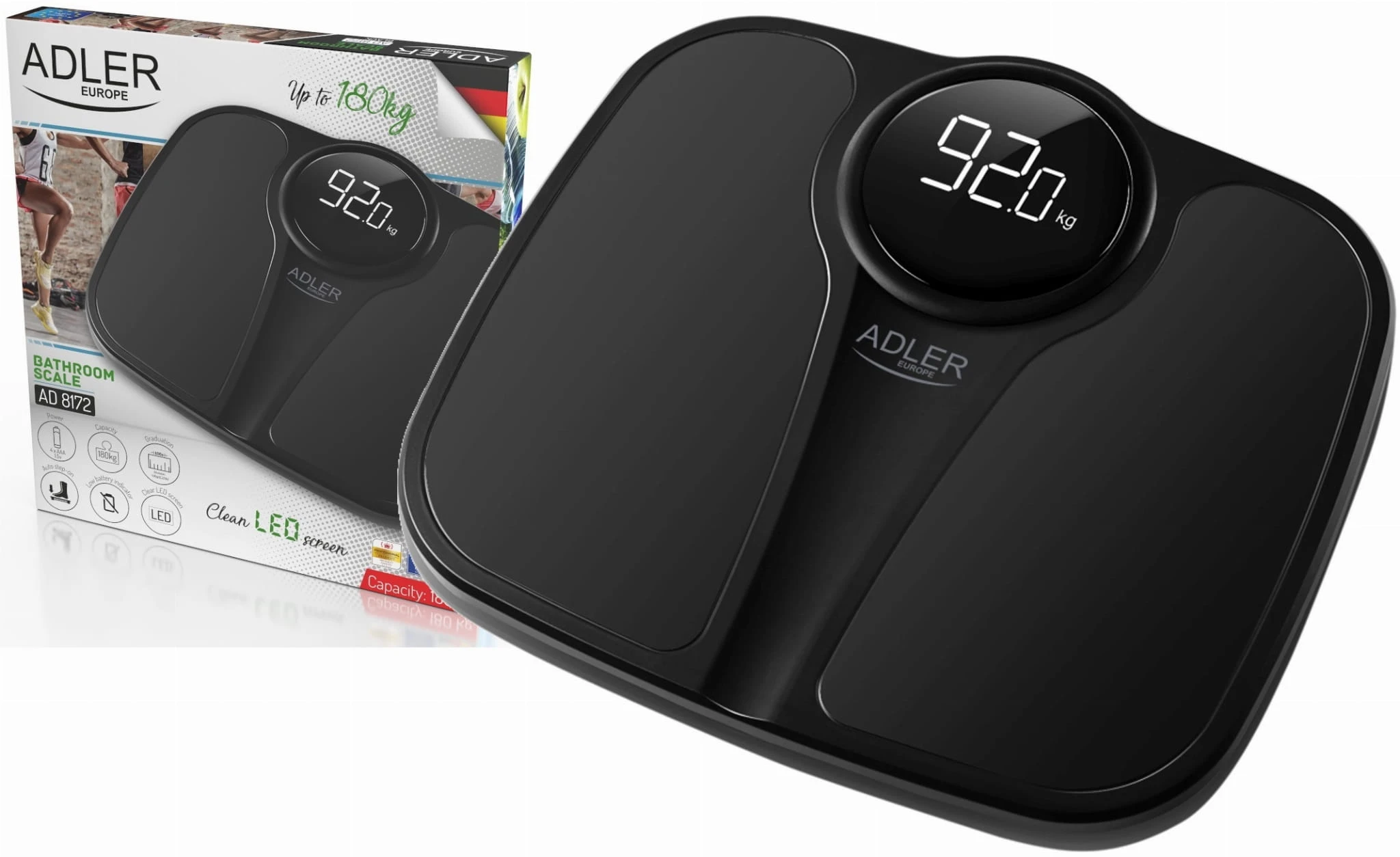 Adler AD 8172 BLACK - Precyzyjna kontrola Twojej wagi!Precyzyjna elektroniczna waga łazienkowa Adler AD 8172 to doskonały wybór dla sportowców, osób odchudzających się i wszystkich, którzy dbają o swoją masę ciała. Dzięki wysokiej dokładności pomiaru (100 g) i czytelnemu wyświetlaczowi LED masz pewność precyzyjnego wyniku. Waga posiada udźwig do 180 kg i jest wykonana z wytrzymałego tworzywa, co gwarantuje bezpieczeństwo i trwałość. Funkcja automatycznego zerowania, włączania i wyłączania sprawia, że jej użytkowanie jest niezwykle proste i wygodne. Zestaw zawiera: